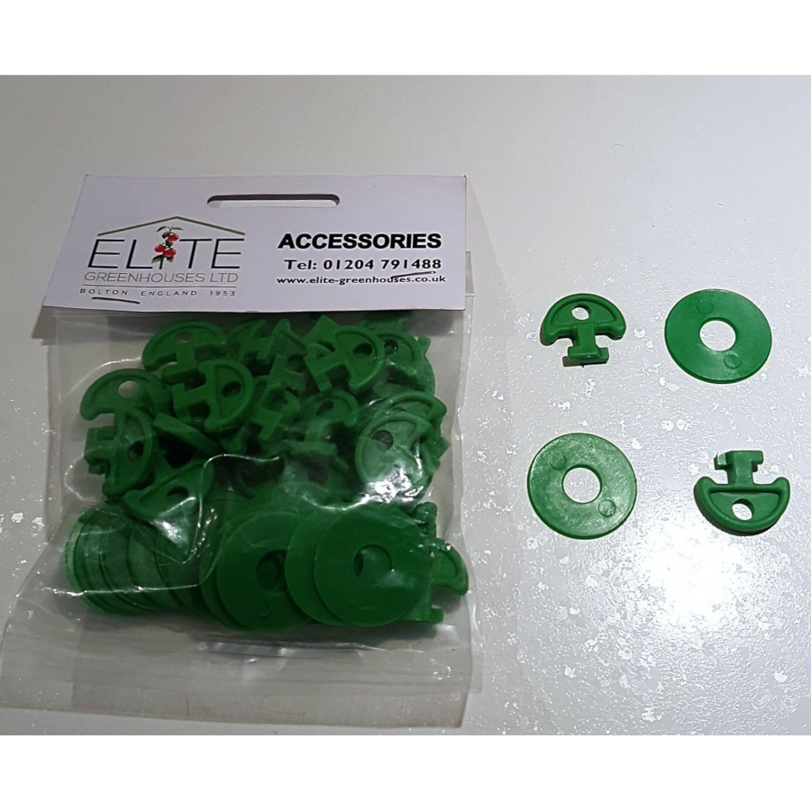 30 Elite Greenhouse Lining Hooks with cropped head attachment. Used to attach lining such as bubble plastic or netting to the inside framework. The plug is pushed through the lining material and then twisted and locked into position in the glazing bar. Green heavy duty plastic. Circle is 25mm across centre and and fixing 15mm wide x 20mm.