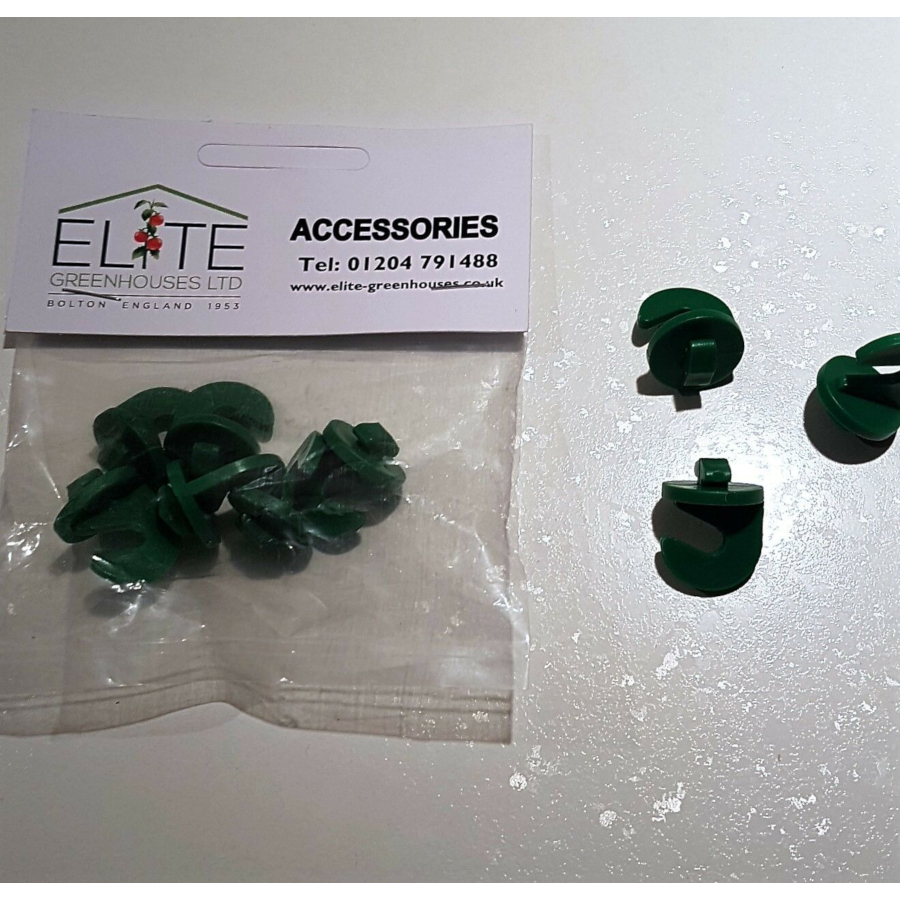 30 Elite Greenhouse Lining Hooks with cropped head attachment. Used to attach lining such as bubble plastic or netting to the inside framework. The plug is pushed through the lining material and then twisted and locked into position in the glazing bar. Green heavy duty plastic. Circle is 25mm across centre and and fixing 15mm wide x 20mm.