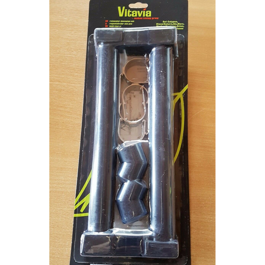 Vitavia Greenhouse Rainwater Downpipe Set. This packaged set comes wih two 9.5" downpipes. two stop ends, two swivel bends and fitments. Supplied in black only. Also suitable for Halls Popular 8 x 6 models. Gutter end measures 3" long x 1.5" wide.